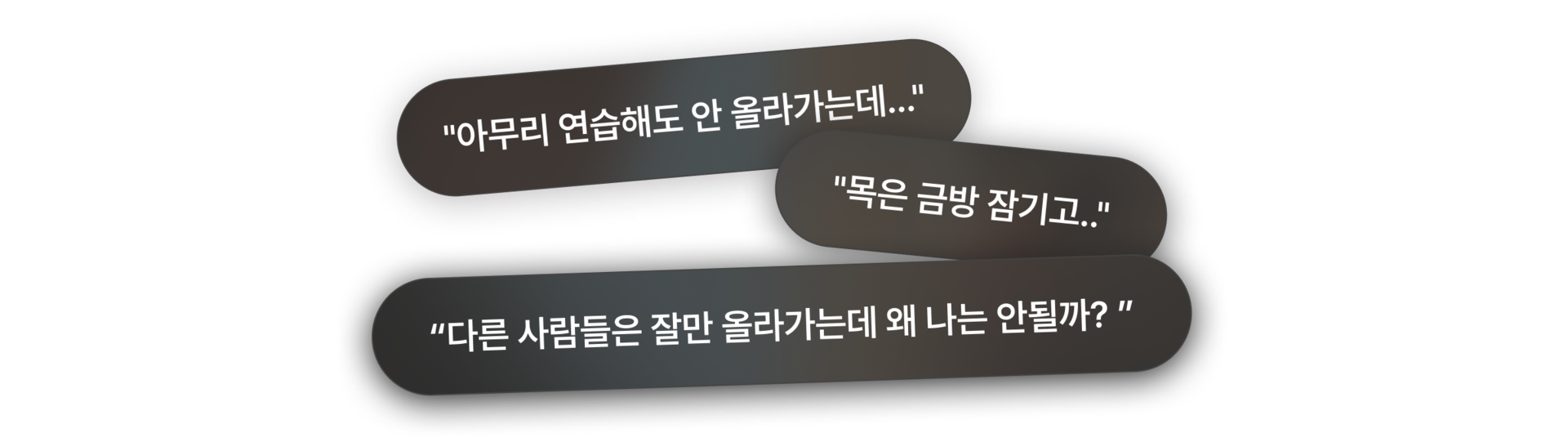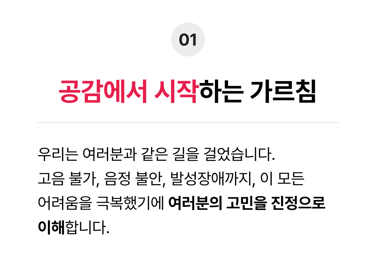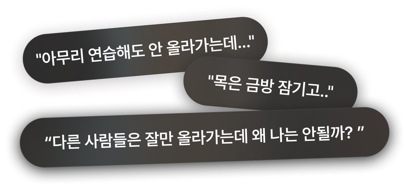 우리는 여러분과 같은 길을 걸었습니다.고음 불가, 음정 불안, 발성장애까지,이 모든 어려움을 극복했기에 여러분의고민을 진정으로 이해합니다.