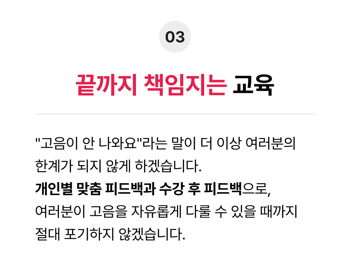 "고음이 안 나와요"라는 말이 더 이상여러분의 한계가 되지 않게 하겠습니다.개인별 맞춤 피드백과 수강 후 피드백으로,여러분이 고음을 자유롭게 다룰 수 있을 때까지절대 포기하지 않겠습니다.