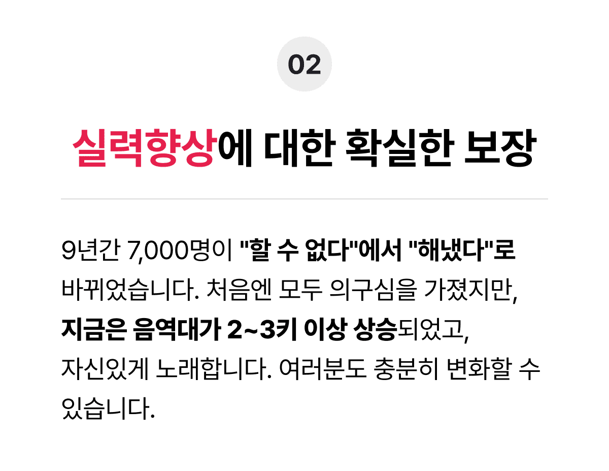 고음은 타고나는 것이 아닙니다.과학적이고 체계적인 커리큘럼, 검증된 솔루션이 있다면,변화는 당연한 결과가 됩니다.그 변화를 반드시 만들어 드리겠습니다.